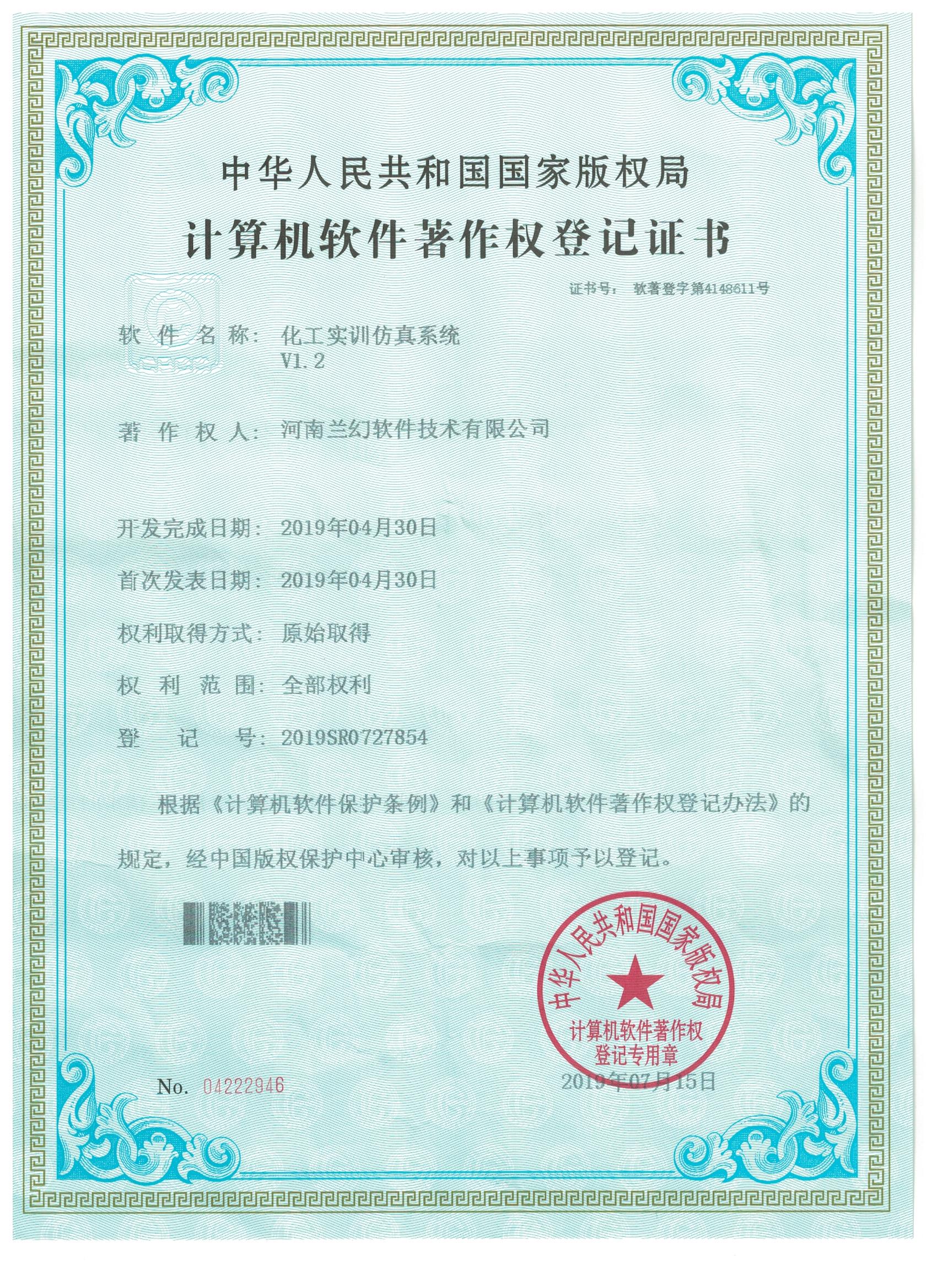 濕地野生動物保護(hù)仿真實(shí)訓(xùn)系統(tǒng)著作權(quán)證書 雙套管傳熱實(shí)驗(yàn)裝置虛擬仿真系統(tǒng)著作權(quán)證書 多釜串聯(lián)實(shí)驗(yàn)裝置虛擬仿真系統(tǒng)著作權(quán)證書